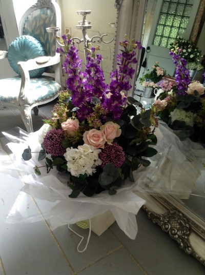 Stunning display of mixed country garden flowers Delphinium, Roses, Allium, Hydrangea