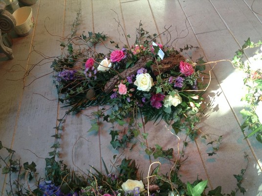 This natural rustic funeral spray has beautiful trailing ivy and natural wood bark.