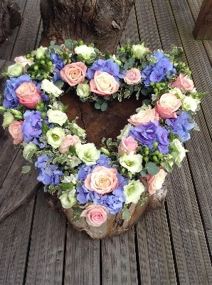 Beautiful pastel loose open heart with hydrangea and roses.