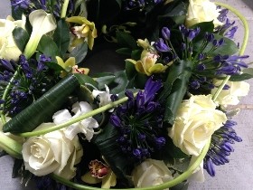 Contemporary style wreath using Calla Lily's, Roses, Agapanthas, Cymbidium Orchoids and beautiful foliage.