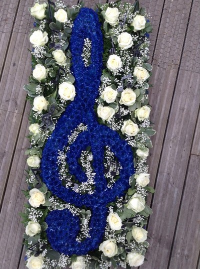 A huge 4ft treble clef in bright blue the favourite colour of a families loved one with beautiful large scented roses surrounding it.