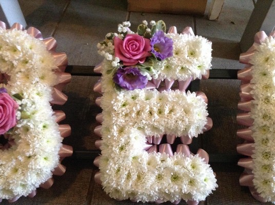 Beautiful white based letters with pink ribbon and bright pink rose sprays £45 per letter.
