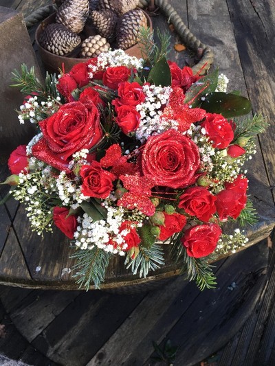 Sweet little wooden box container filled to the brim with sparkley red flowers, The perfect gift.