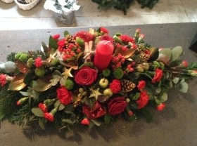 A traditional red gold and fruit christmas table display with candles.