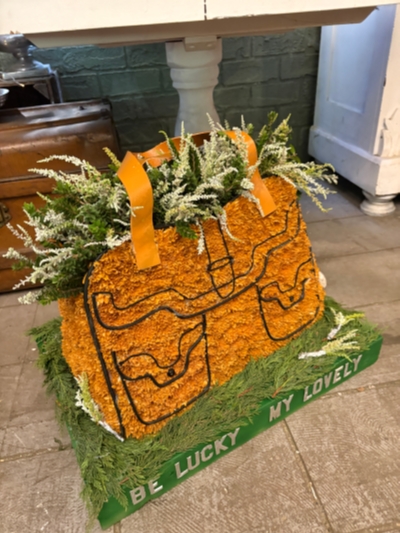 A beautiful tan leather bag full of Lucky Heather.