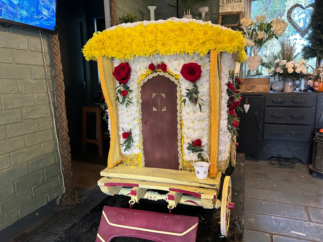 Designed in the style of a traditional Romani vardo, this gypsy wagon floral tribute is ideal for those wishing to honour cultural traditions with authenticity and care. Each arrangement is handmade by skilled florists with experience in traveller funeral flowers, ensuring attention to detail, strength, and presentation throughout the service.