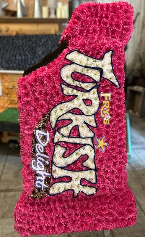 Our Turkish Delight Chocolate Bar Funeral Tribute is a beautifully handcrafted floral arrangement designed to honour the memory of someone who loved this classic confection. Carefully created using fresh, high-quality blooms, this unique tribute is shaped to resemble a traditional Turkish Delight chocolate bar, offering a meaningful and personal farewell.